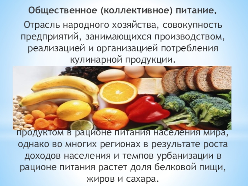 Зерновые по-прежнему являются главным продуктом в рационе питания населения мира, однако во многих регионах в результате роста доходов населения и темпов урбанизации в рационе питания растет доля белковой пищи, жиров и сахара.