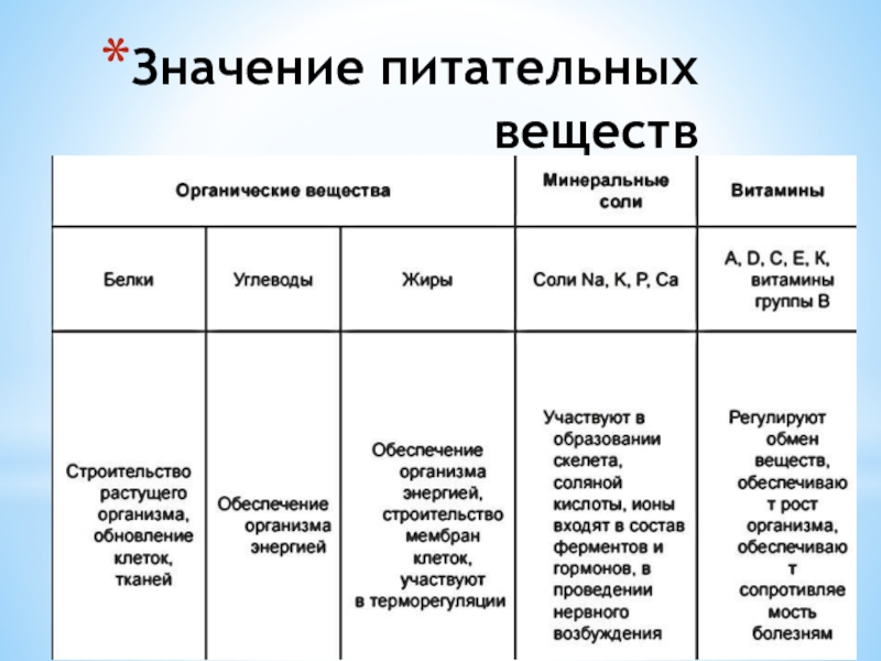пищи, содержащей сложные органические вещества (белки, жиры, углеводы), минеральные соли, витамины и воду. Все эти вещества необходимы для удовлетворения потребности организма в энергии, для осуществления биохимических процессов, протекающих во всех органах и тканях.