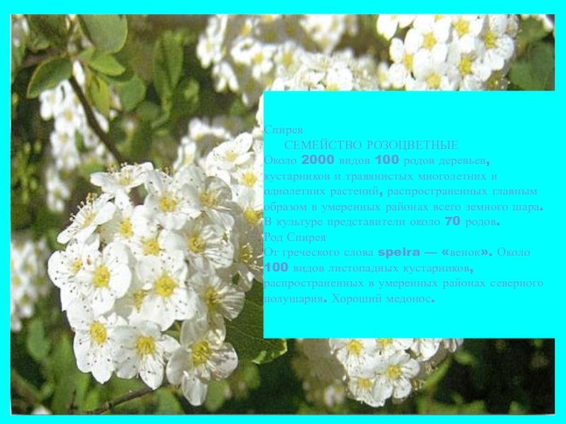 От греческого слова speira — «венок». Около 100 видов листопадных кустарников, распространенных в умеренных районах северного полушария. Хороший медонос.