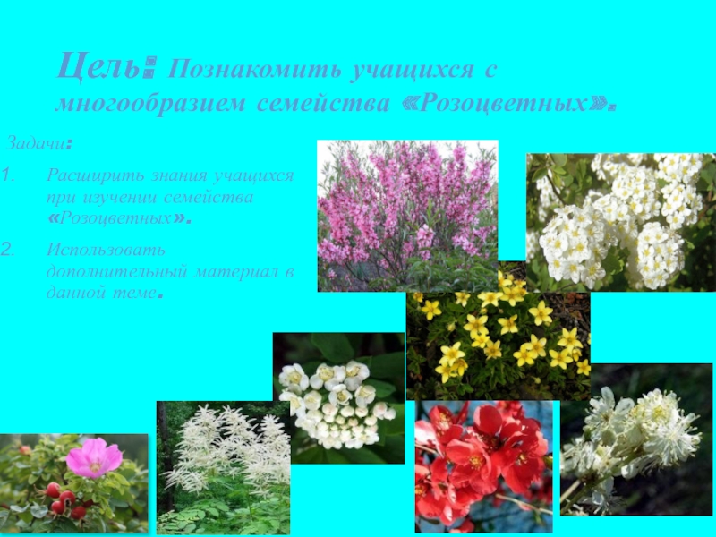 Слайд 2Цель: Познакомить учащихся с многообразием семейства «Розоцветных».
