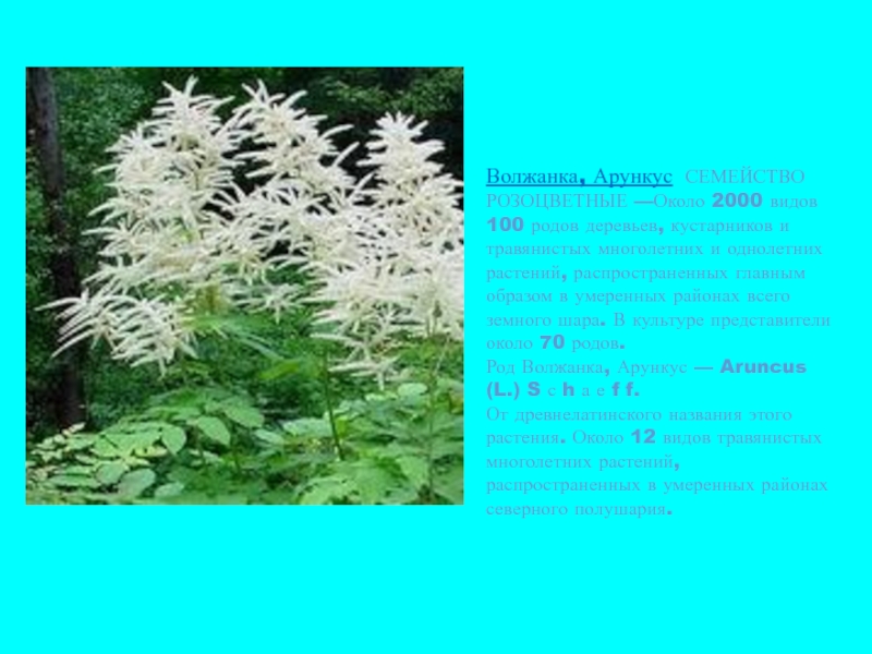 Слайд 10Волжанка, Арункус СЕМЕЙСТВО РОЗОЦВЕТНЫЕ —Около 2000 видов 100 родов деревьев, кустарников