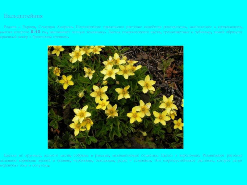и корневищное, высота которого 8-10 см, напоминает лесную землянику. Листья темно-зеленого цвета, трехлопастные и зубчатые, зимой образуют красивый ковер с бронзовым отливом.