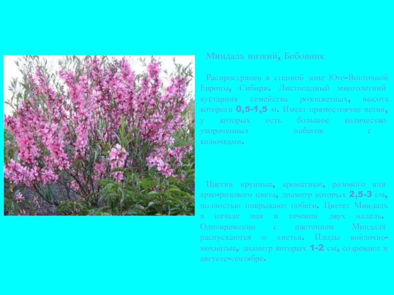 Цветки крупные, ароматные, розового или ярко-розового цвета, диаметр которых 2,5-3 см, полностью покрывают побеги. Цветет Миндаль в начале мая в течении двух недель. Одновременно с цветением Миндаля распускаются и листья. Плоды войлочно-мохнатые, диаметр которых 1-2 см, созревают в августе-сентябре.
