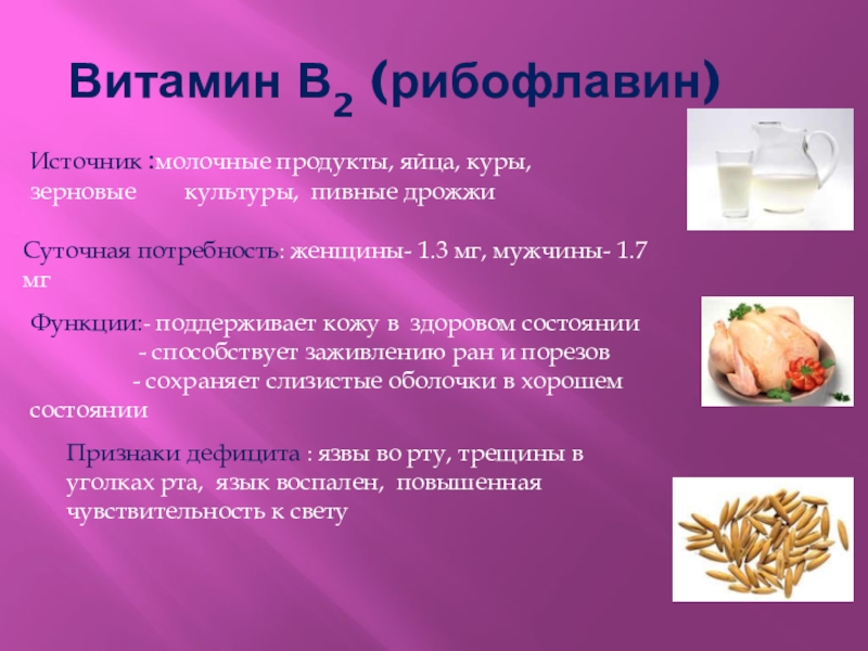 Суточная потребность: женщины- 1.3 мг, мужчины- 1.7 мг