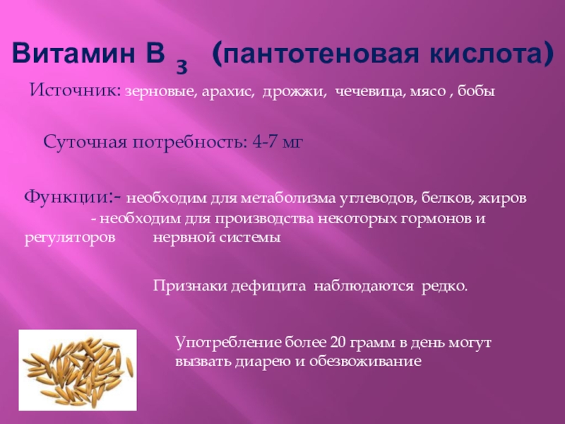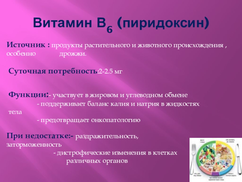 Функции:- необходим для метаболизма углеводов, белков, жиров