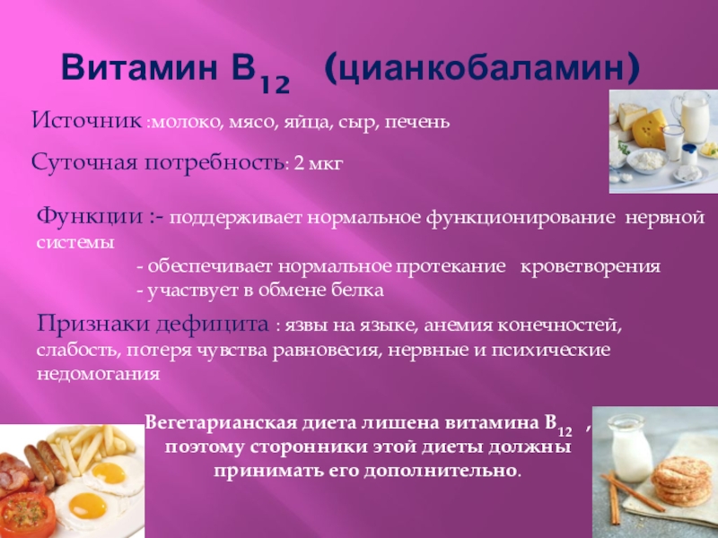 Вегетарианская диета лишена витамина В12 , поэтому сторонники этой диеты должны принимать его дополнительно.