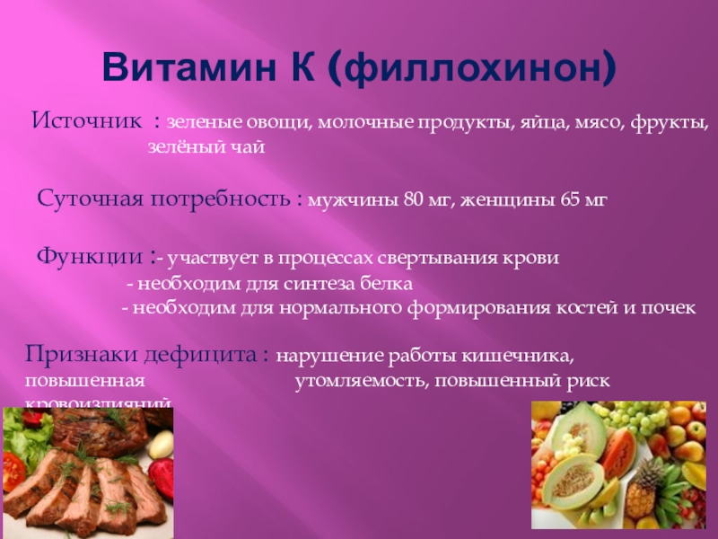 Признаки дефицита : нарушение работы кишечника, повышенная утомляемость, повышенный риск кровоизлияний