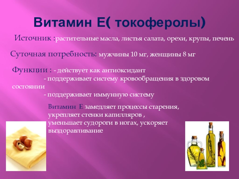 Витамин Е замедляет процессы старения, укрепляет стенки капилляров , уменьшает судороги в ногах, ускоряет выздоравливание