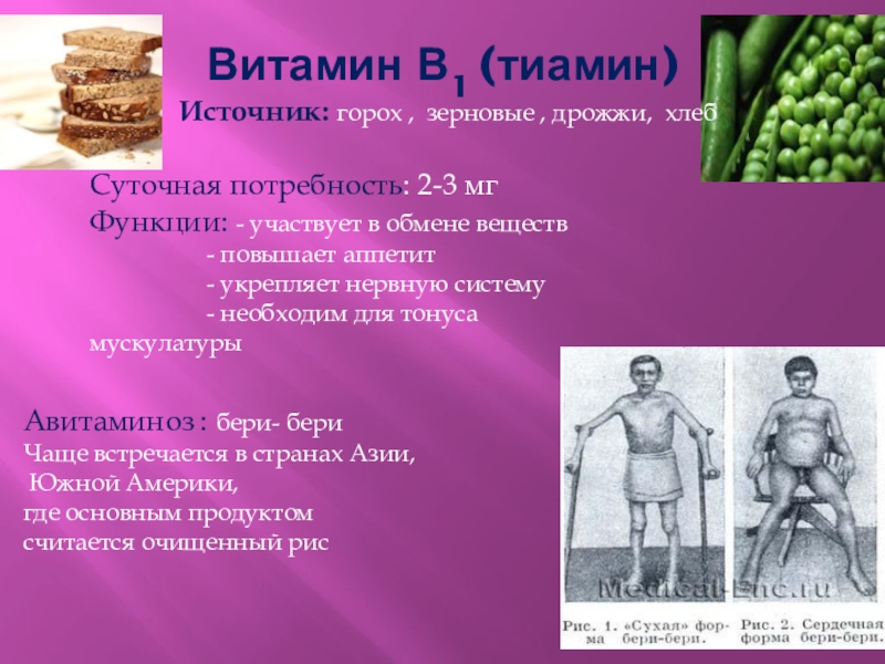 Источник: зерновые, арахис, дрожжи, чечевица, мясо , бобы