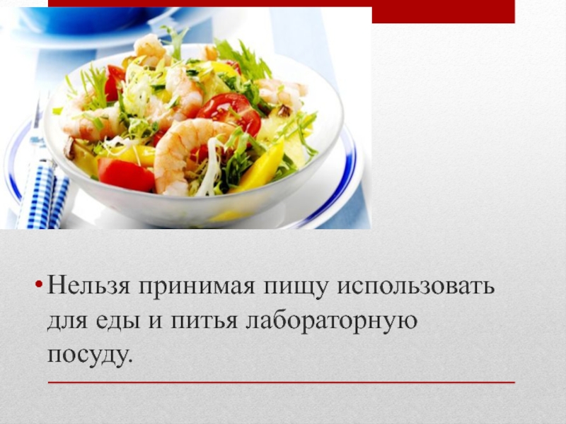 Слайд 3Нельзя принимая пищу использовать для еды и питья лабораторную посуду.