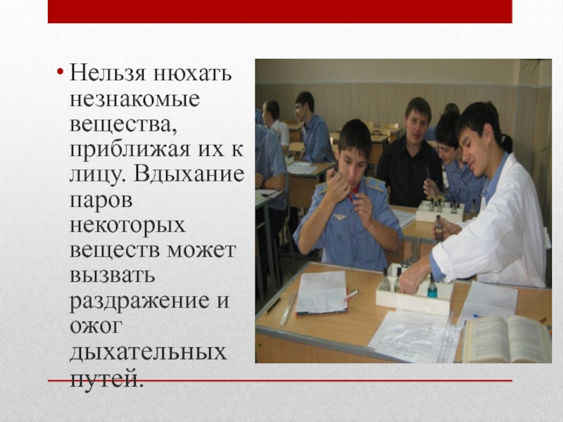 Нельзя нюхать незнакомые вещества, приближая их к лицу. Вдыхание паров некоторых веществ может вызвать раздражение и ожог