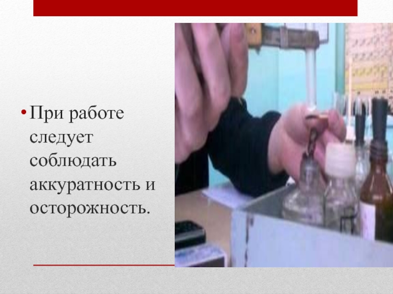 Слайд 8При работе следует соблюдать аккуратность и осторожность.