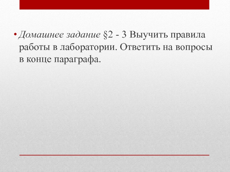 Домашнее задание §2 - 3 Выучить правила работы в лаборатории. Ответить на вопросы в конце параграфа.