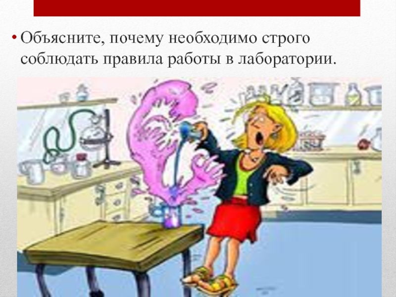 Слайд 16Объясните, почему необходимо строго соблюдать правила работы в лаборатории.