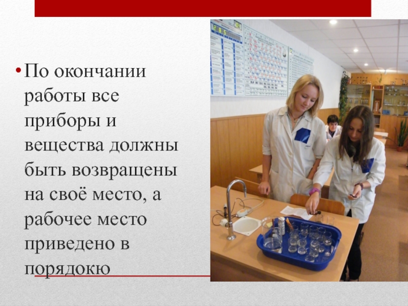 Слайд 9По окончании работы все приборы и вещества должны быть возвращены на
