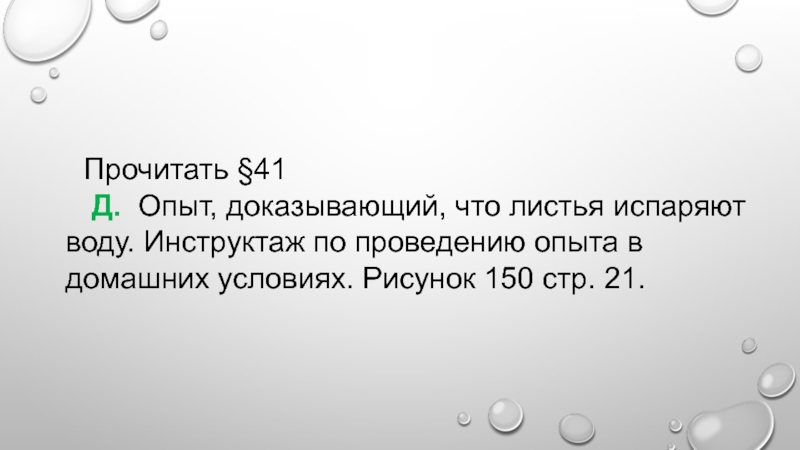 Прочитать §41 Д. Опыт, доказывающий, что листья испаряют воду. Инструктаж по проведению опыта в домашних условиях. Рисунок 150