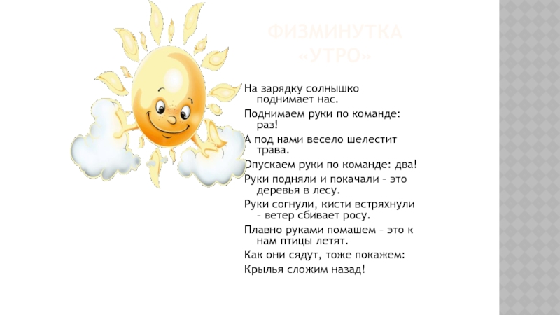 Физминутка «Утро»На зарядку солнышко поднимает нас.Поднимаем руки по команде: раз!А под нами весело шелестит трава.Опускаем руки по