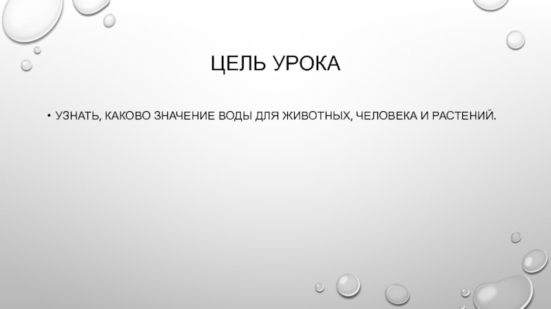 Цель урокаУзнать, каково значение воды для животных, человека и растений.