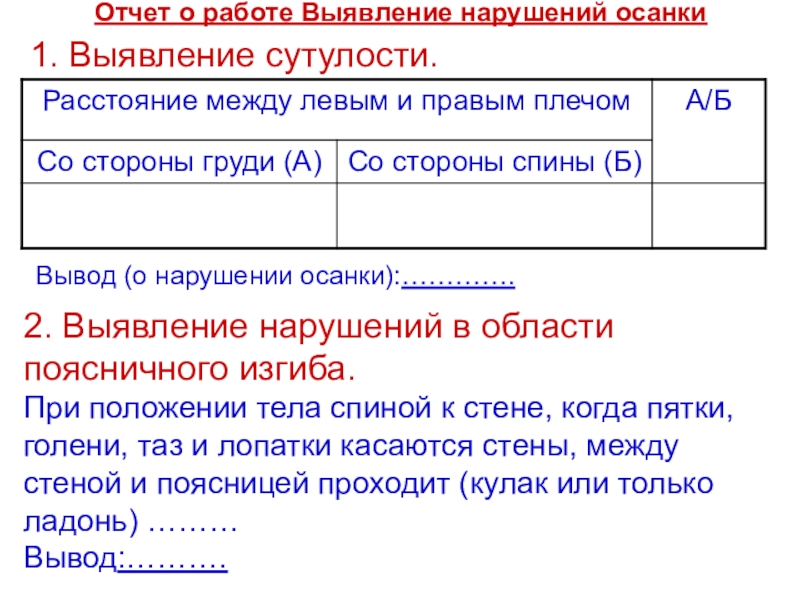 При положении тела спиной к стене, когда пятки, голени, таз и лопатки касаются стены, между стеной и поясницей проходит (кулак или только ладонь) ………