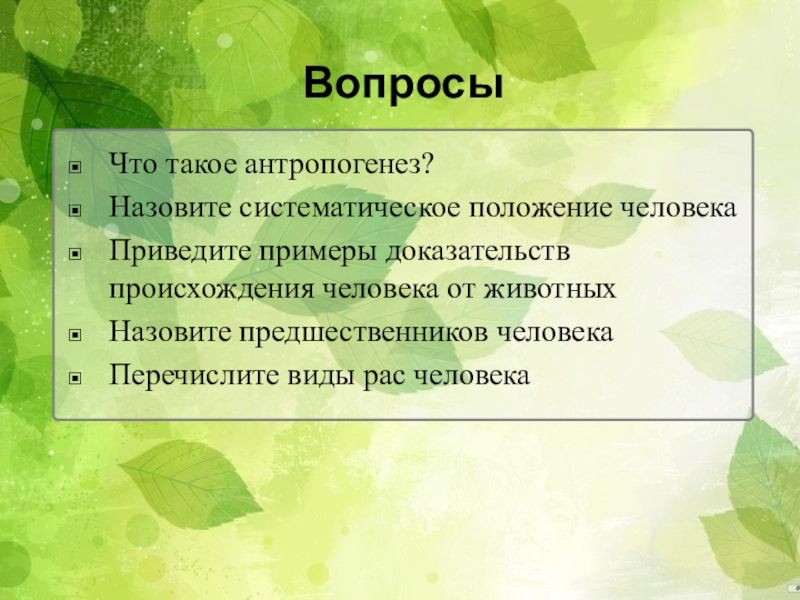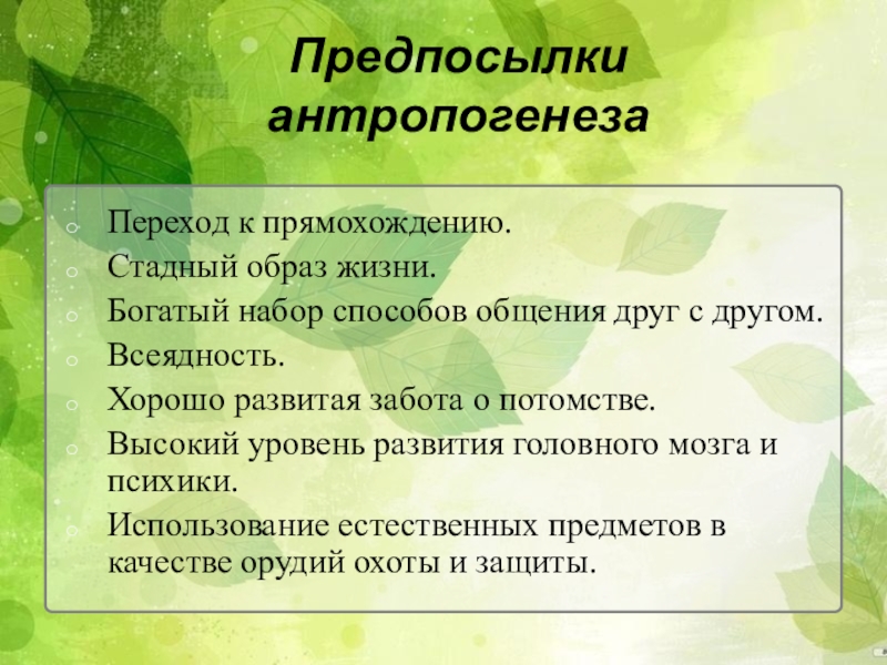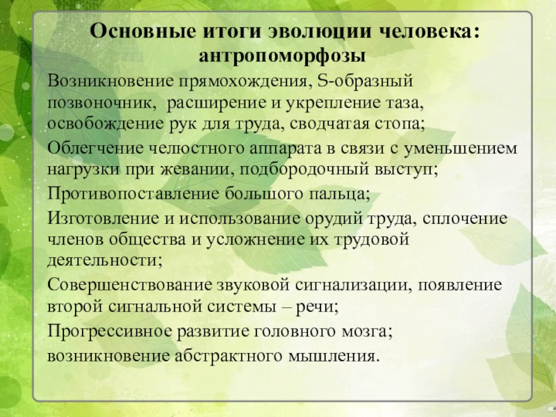 Антропогене́з – часть биологической эволюции, которая привела к появлению человека разумного (лат. Homo sapiens),