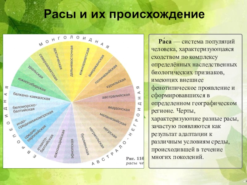 определённых наследственных биологических признаков, имеющих внешнее фенотипическое проявление и сформировавшихся в определенном географическом регионе. Черты, характеризующие разные расы, зачастую появляются как результат адаптации к различным условиям среды, происходившей в течение многих поколений.
