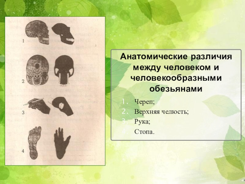 Слайд 8Сходство и различие между человеком и человекообразными обезьянами