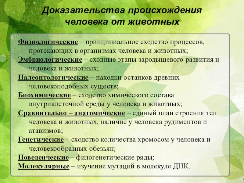Биохимические – сходство химического состава внутриклеточной среды у человека и животных;