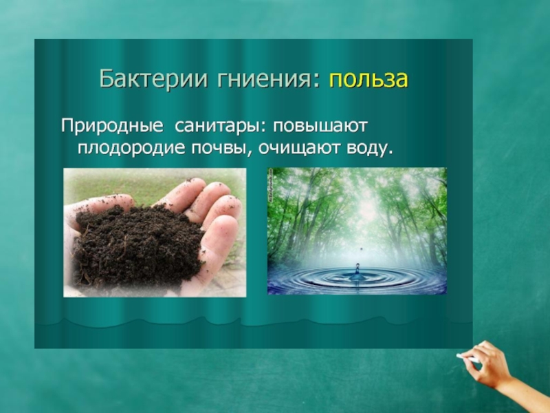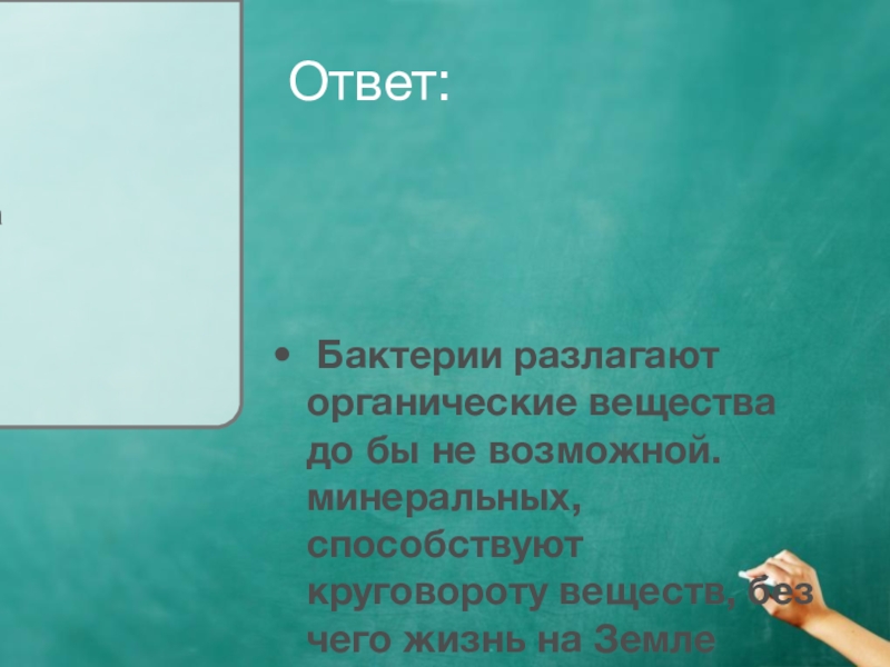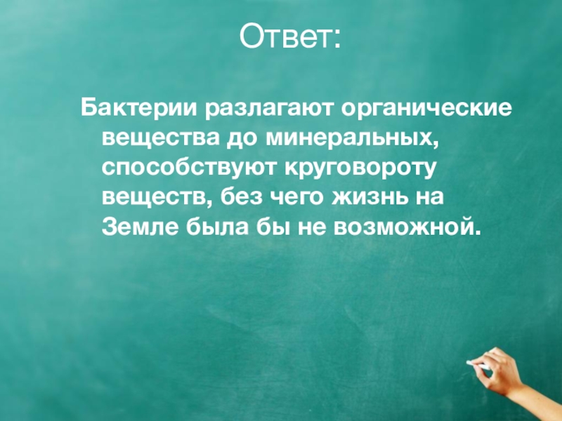 Бактерии разлагают органические вещества до минеральных, способствуют круговороту веществ, без чего жизнь на Земле была бы не возможной.
