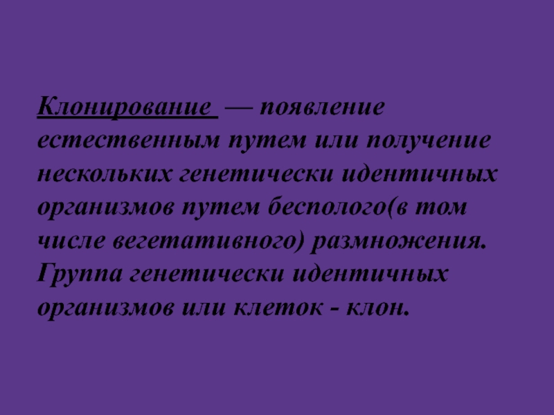 Клонирование — появление естественным путем или получение нескольких генетически идентичных организмов путем бесполого(в том числе