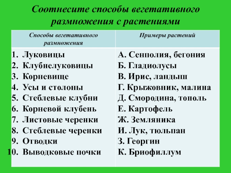Слайд 13Соотнесите способы вегетативного размножения с растениями