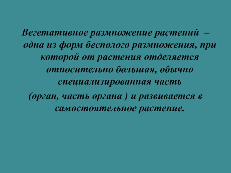 Вегетативное размножение растений – одна из форм бесполого размножения, при которой от растения отделяется относительно большая, обычно