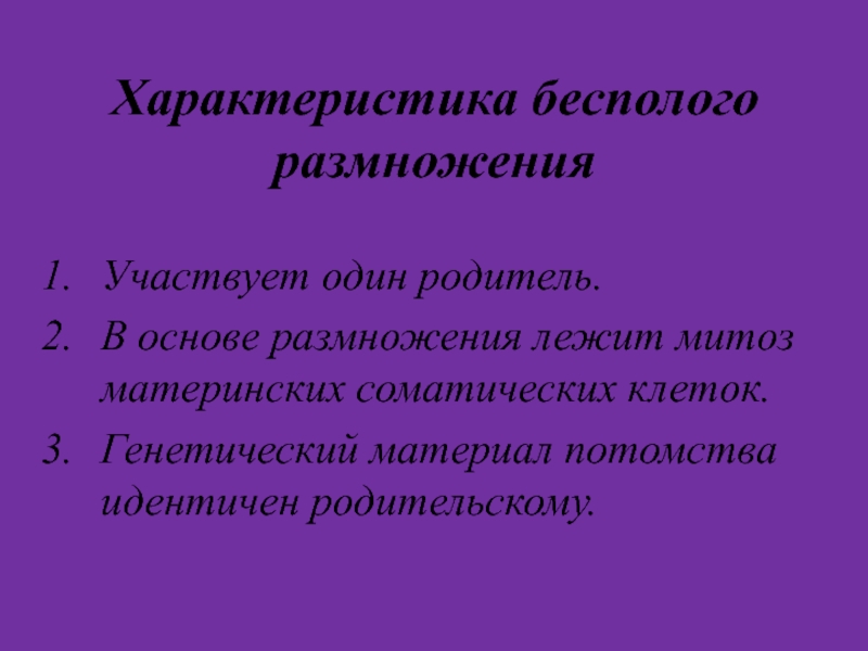 Характеристика бесполого размноженияУчаствует один родитель.В основе размножения лежит митоз материнских соматических клеток.Генетический материал потомства идентичен родительскому.