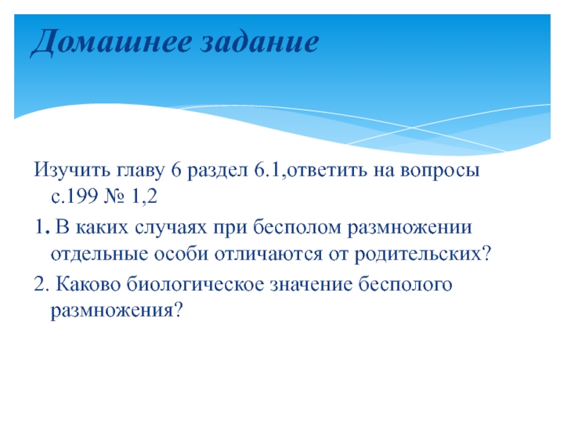 Домашнее заданиеИзучить главу 6 раздел 6.1,ответить на вопросы с.199 № 1,21. В каких случаях при бесполом размножении
