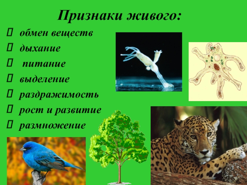 Признаки живого: обмен веществдыхание питаниевыделениераздражимостьрост и развитиеразмножение