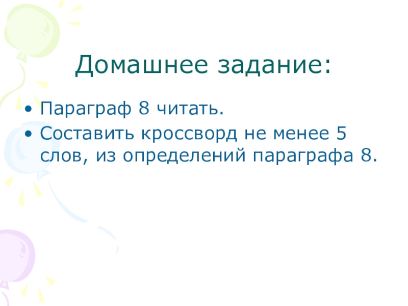 Домашнее задание:Параграф 8 читать.Составить кроссворд не менее 5 слов, из определений параграфа 8.