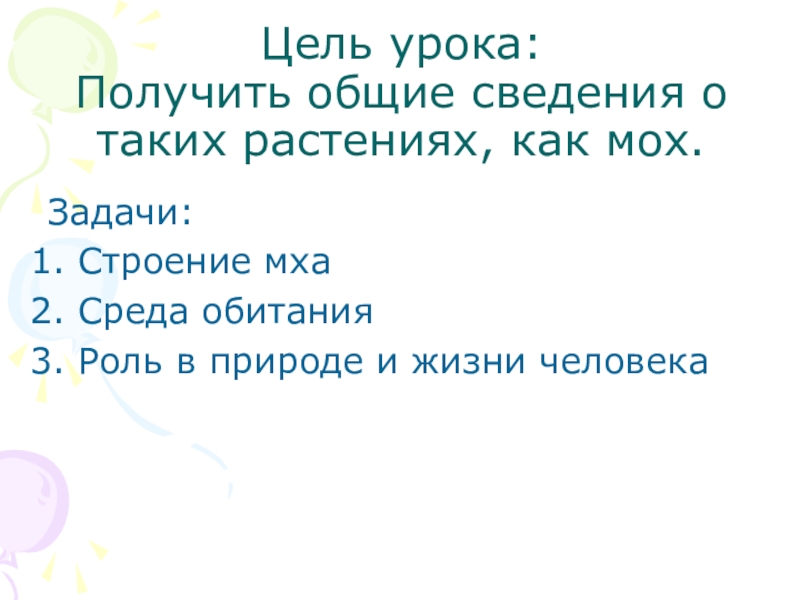 Цель урока: Получить общие сведения о таких растениях, как мох.Задачи:Строение мхаСреда обитанияРоль в природе и жизни человека