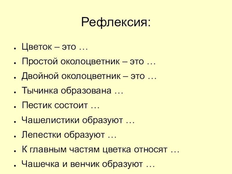 Рефлексия: Цветок – это …Простой околоцветник – это …Двойной околоцветник – это …Тычинка образована …Пестик состоит …Чашелистики