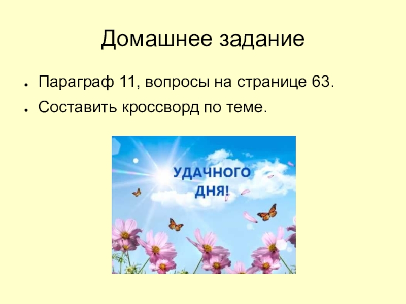 Домашнее заданиеПараграф 11, вопросы на странице 63. Составить кроссворд по теме.