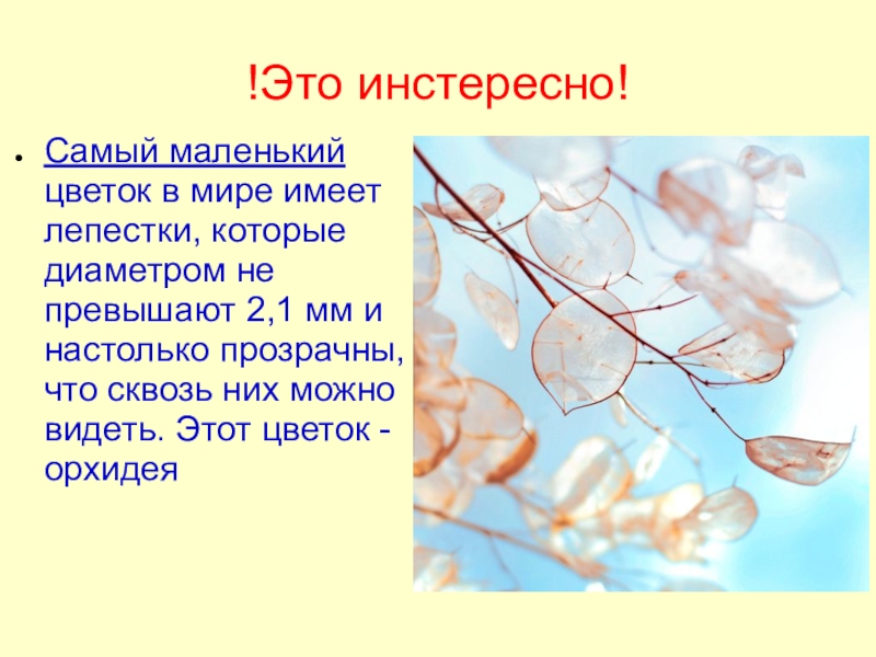 !Это инстересно!Самый маленький цветок в мире имеет лепестки, которые диаметром не превышают 2,1 мм и настолько прозрачны,