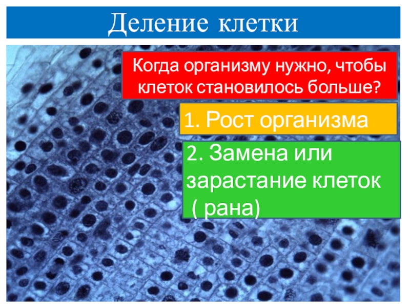 Деление клеткиКогда организму нужно, чтобы клеток становилось больше?1. Рост организма2. Замена или зарастание клеток ( рана)