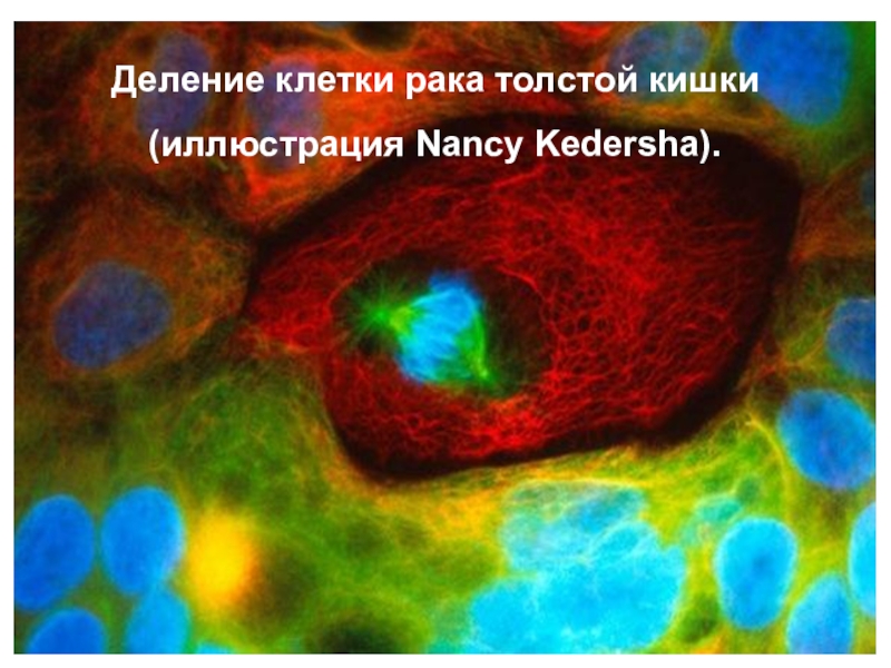 Слайд 14Деление клетки рака толстой кишки (иллюстрация Nancy Kedersha).