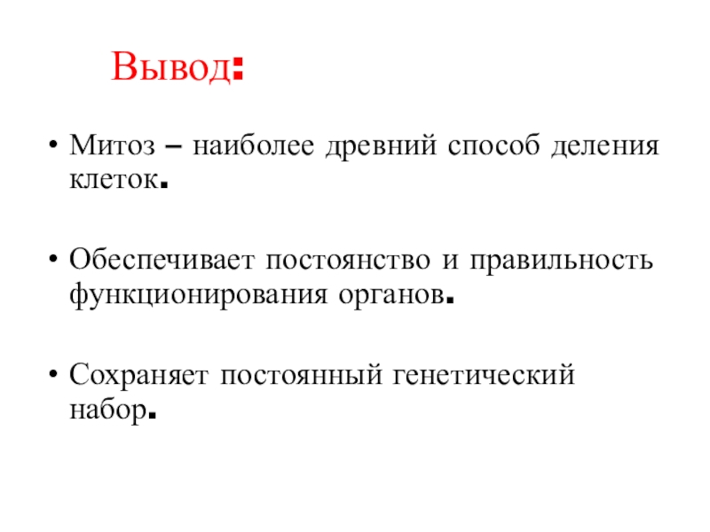 Вывод: Митоз – наиболее древний способ деления клеток. Обеспечивает постоянство и правильность функционирования органов. Сохраняет постоянный генетический