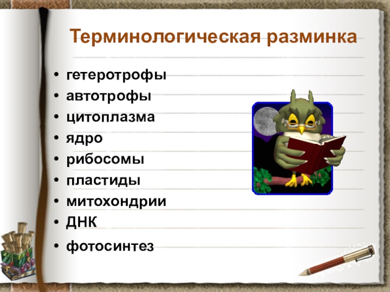 Терминологическая разминкагетеротрофыавтотрофыцитоплазмаядрорибосомыпластидымитохондрииДНКфотосинтез