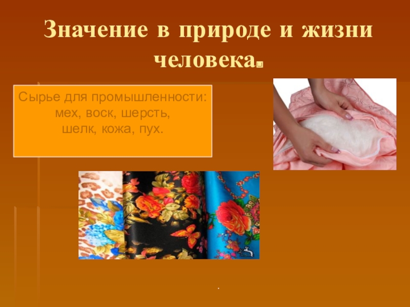 .Значение в природе и жизни человека.Сырье для промышленности: мех, воск, шерсть, шелк, кожа, пух.