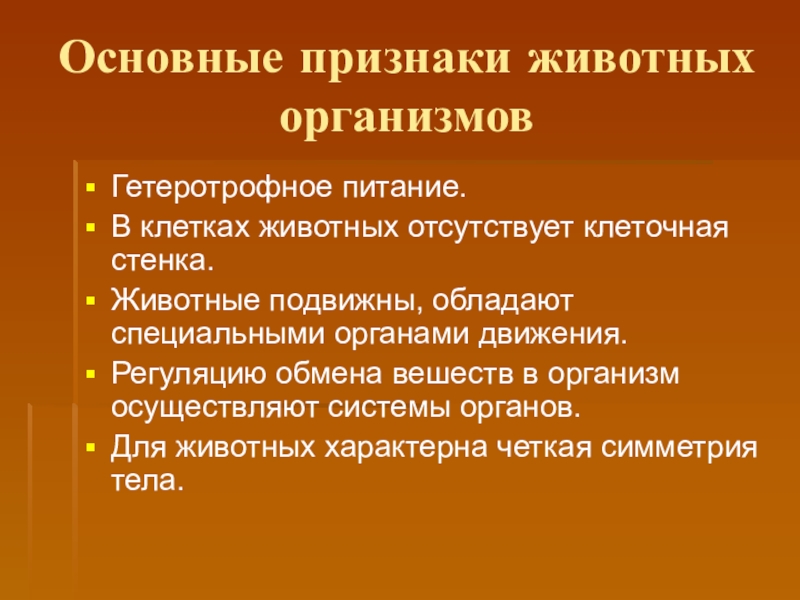 Основные признаки животных организмовГетеротрофное питание.В клетках животных отсутствует клеточная стенка.Животные подвижны, обладают специальными органами движения.Регуляцию обмена вешеств