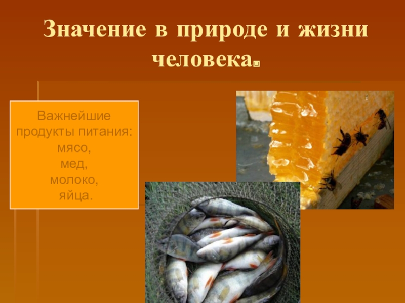 Значение в природе и жизни человека.Важнейшие продукты питания: мясо, мед, молоко, яйца.