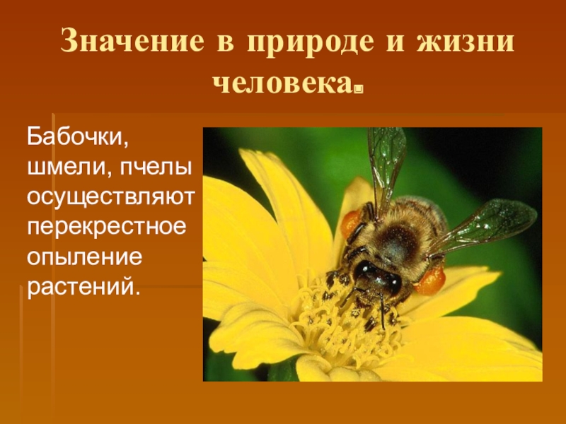 Значение в природе и жизни человека.  Бабочки, шмели, пчелы осуществляют перекрестное опыление растений.