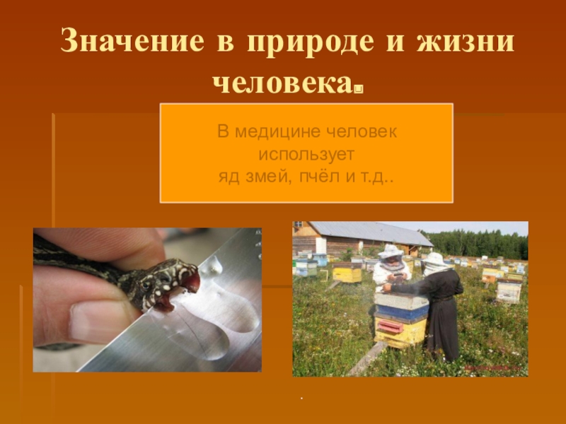 .Значение в природе и жизни человека.В медицине человек использует яд змей, пчёл и т.д..