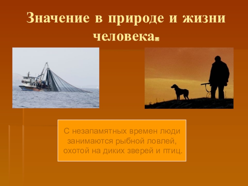 Значение в природе и жизни человека.С незапамятных времен люди занимаются рыбной ловлей, охотой на диких зверей и