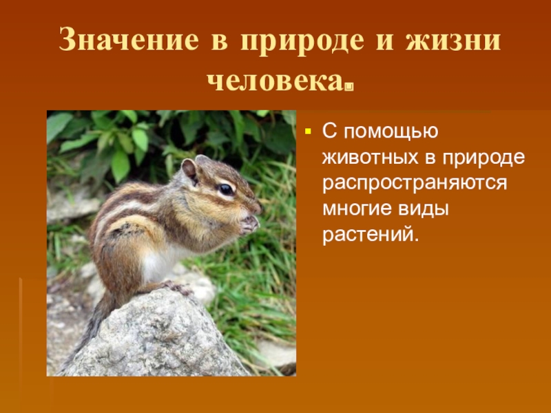 Значение в природе и жизни человека.С помощью животных в природе распространяются многие виды растений.